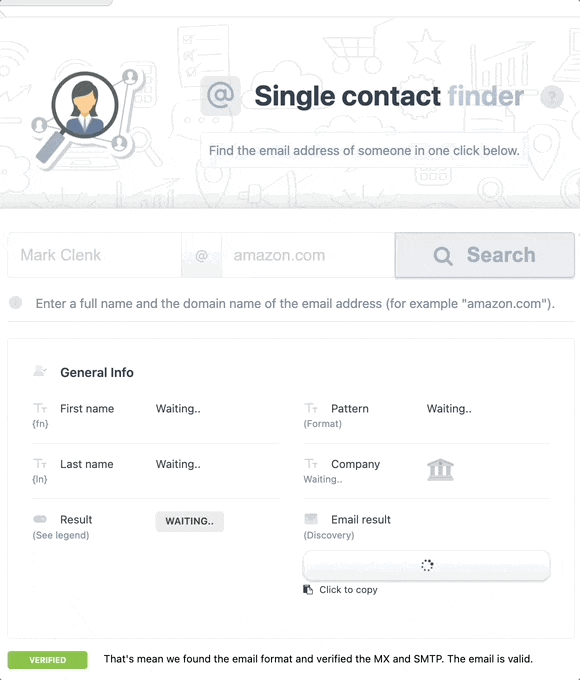 You will be able to upload a CSV with this information: first name, last name, and company name (or domain). Once you upload the data, the tool will try to find the email of each contact from the email format (for example, first.last@company.com). This tool is perfect for discovering emails from a list of business data.